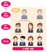 承認は、発注者→係長→課長→部長→総務部長といった4段階まで組めます。