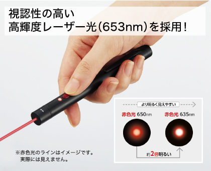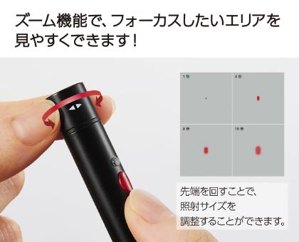 通常の約2倍の明るさを持つ赤色光を採用し、照射サイズを約5〜80mm(距離3m時)に調整可能です。より見やすいプレゼンテーションを実現します。